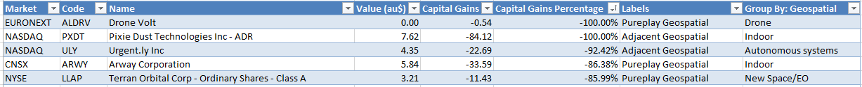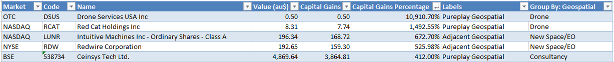 What can we tell? The only position of any significance amongst these is Ceinsys, an Indian firm. You can tell by their value, nearly $AUD5,000. The rest are tiny positions, far below their original $AUD100 starting point except Intuitive Machines and Redwire. And what do we know about those two? They’re in the tortured Earth Observation/New Space subindex. For an expert review of this subindex, Case Closed is well worth a follow: