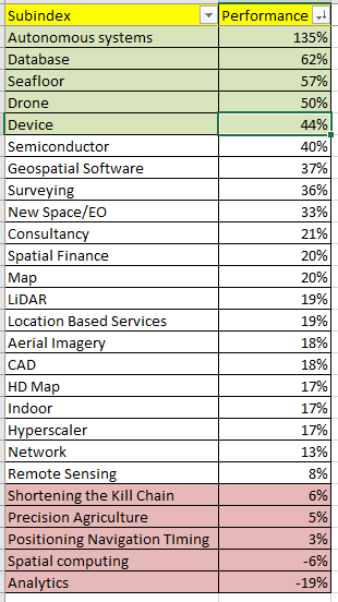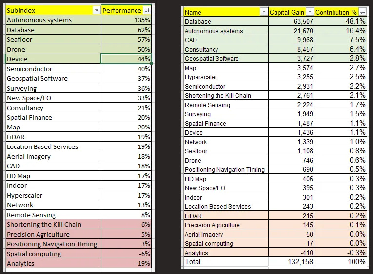 We can conclude from this that database and autonomous systems subindices performed and contributed highly. CAD, Consultancy and Geospatial Software on the other hand did not perform particularly highly but nevertheless contributed strongly. This is likely due to their containing very many stocks - Consultancy is over 40 for example, more than 10% of the total index count of stocks. Regarding performance, we can see that Seafloor, Drone and Device subindices performed well this year but did not make it into the top five in terms of contribution. This is due to both size and historical performance. Seafloor has less than 10 stocks in it and they’re all small companies. Drone and Device subindices have performed poorly in the past, so the value overall of these subindices is low. Hence it is tough for them to contribute a lot to overall gains despite performing well.