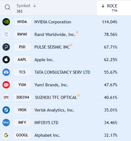 In the end, long term decent return on capital employed is what sorts the wheat from the chaff. Hence, another way to use the screener is to put trailing twelve months ROCE in as a column and return that metric against every component of the index: