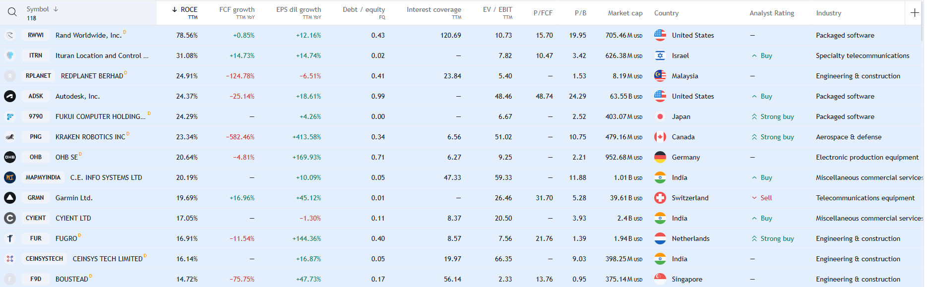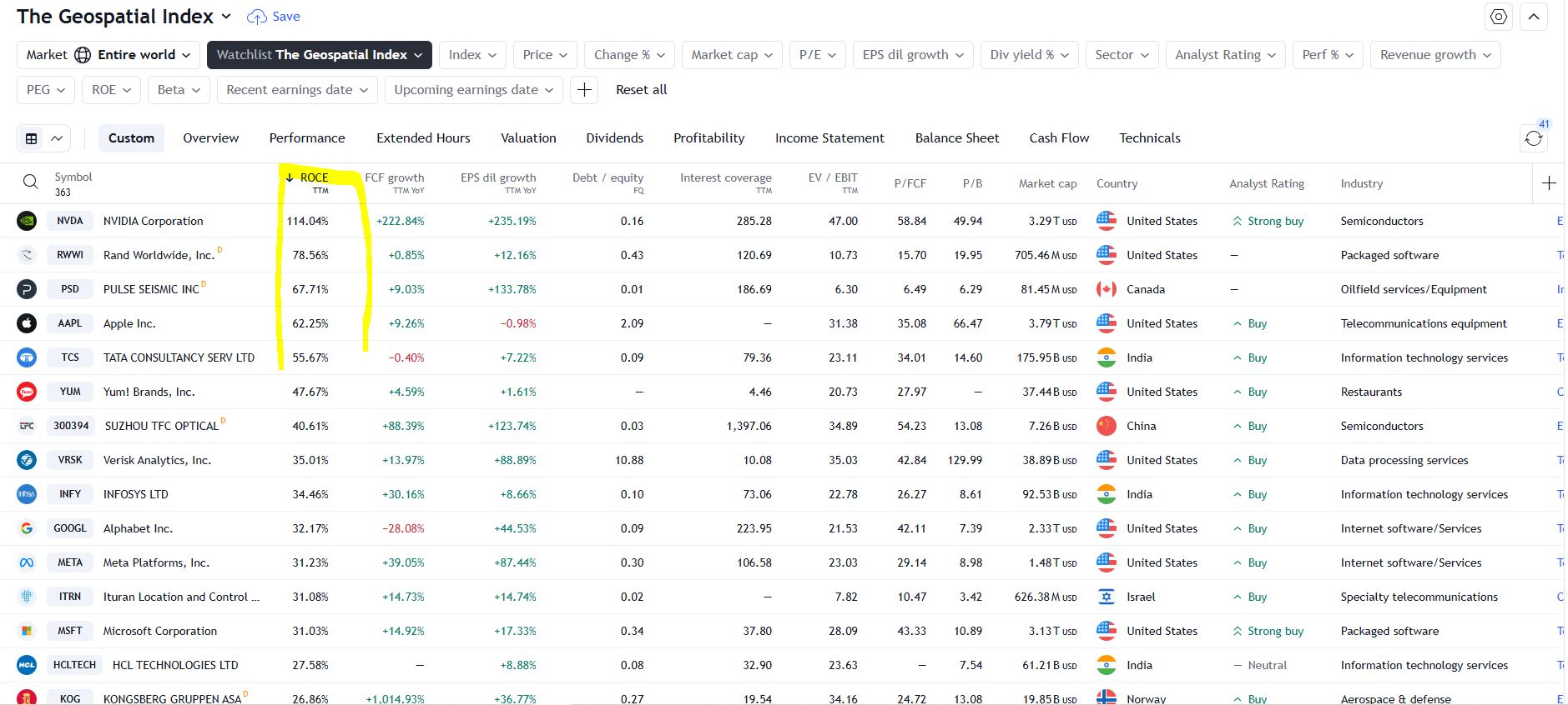 Oh, you’re wondering about pure-play geospatial stocks? There were only 13 that made the 15% ROCE threshold this year, here they are: