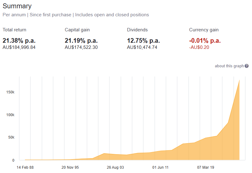 Why do I know this? Look at Oracle, the dominant stock of this portfolio. With dividends reinvested and adjusting for stock splits, it has compounded at 21% since its IPO on 12 March 1986. You can check other stocks here. This has resulted in the initial $100 compounding to $AUD185,000 now if you had bought at the IPO back then: