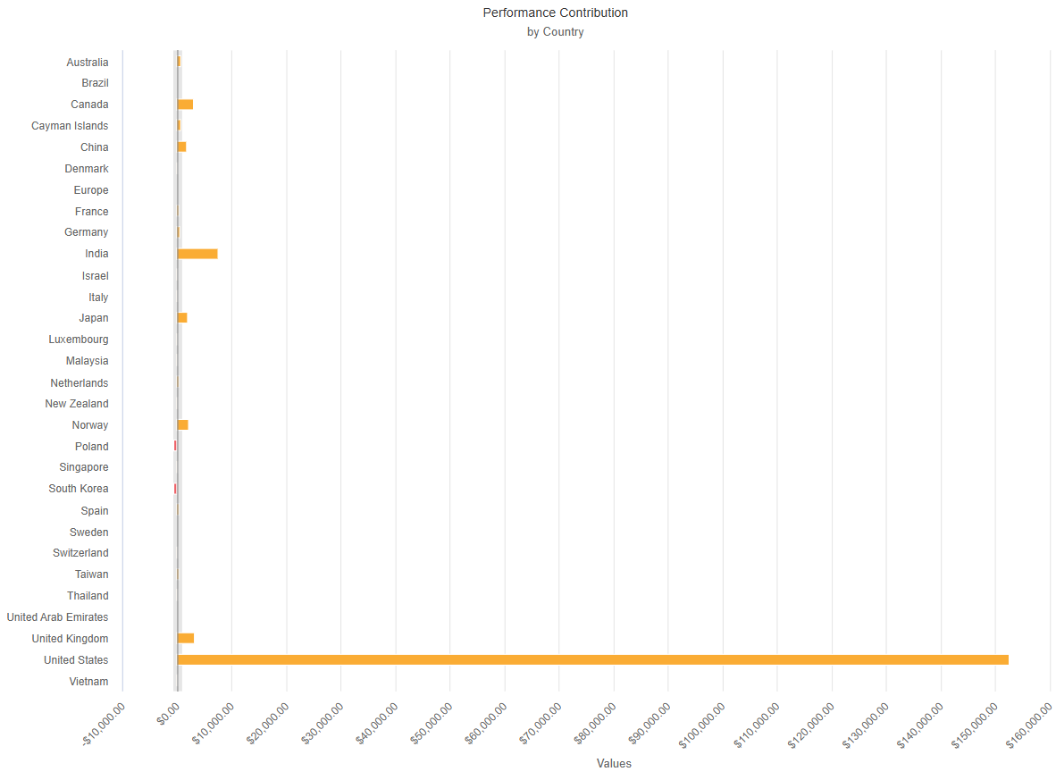 The only one that matters is the US, contributing 86% of the overall index gain for the year. The rest of the world, 29 other countries, are left with only 14% of the gains to fight over. Interestingly, India stands out here, whose stock market has been on an absolute tear since COVID. There are 19 companies in the index from India, yet they together contribute fully 4% of the overall index gain for the year.