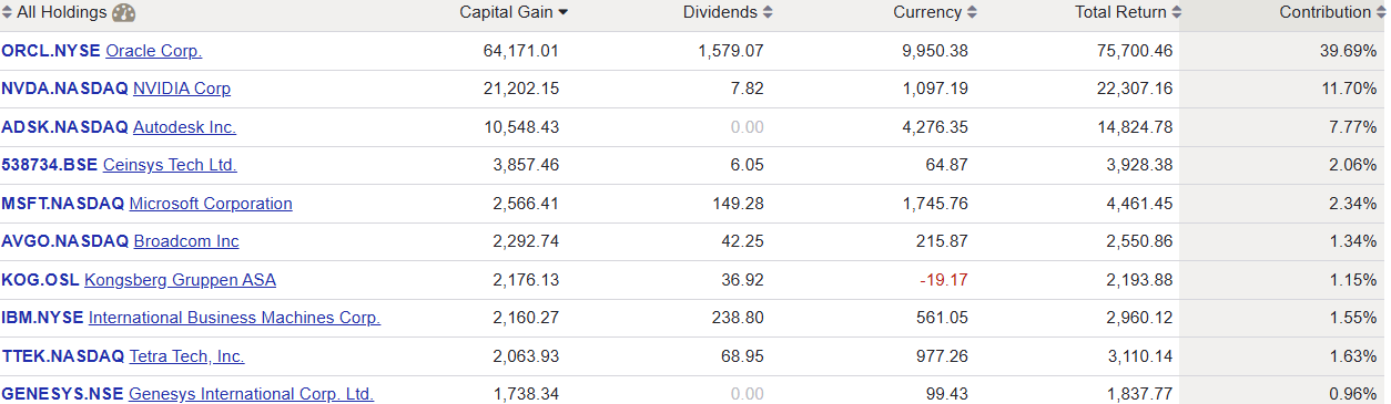 In all seriousness, we can summarise things by defining the hunting ground. American stocks contribute the vast majority of gains. Due to a combination of time in the market and growth, the subindices of Database and Autonomous Systems are another way to see what to focus on through accounting for nearly 60% of gains this year. If you want to sharpen the focus to the ultimate degree, individual stocks Oracle and Nvidia, from the same two subindices respectively, accounted for 50% of overall gains. 2 stocks. Amongst 362 stocks.