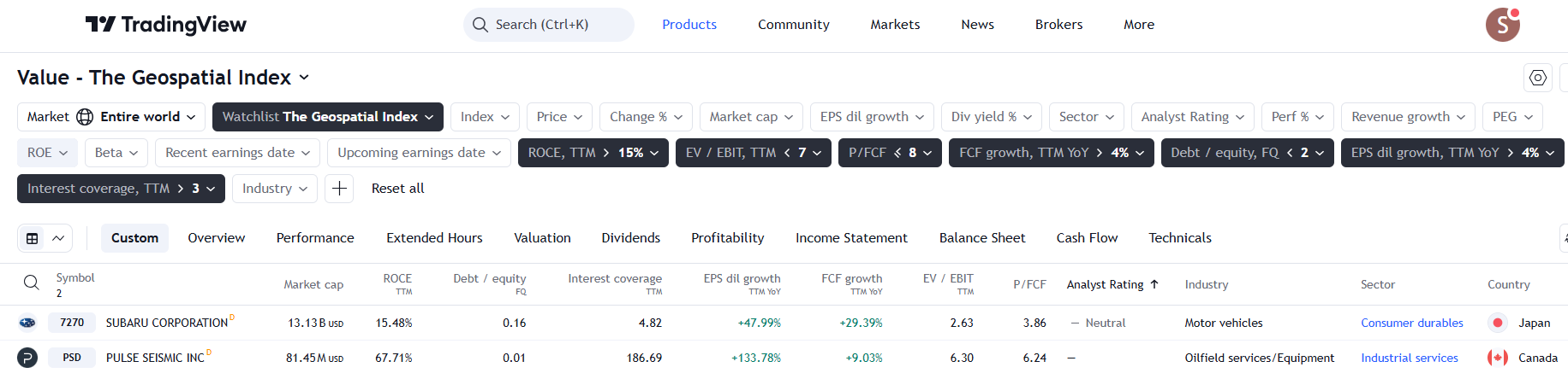I discovered an incredibly useful aspect of the TradingView screening tool this year. One can feed a watchlist into it. So here is a value investor’s screen set to return only the interesting stocks from the index - Pulse Seismic and Subaru make the cut. The former is probably more interesting. Japanese automakers are known to stay at low multiples forever.