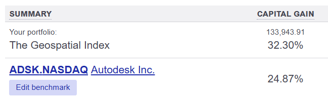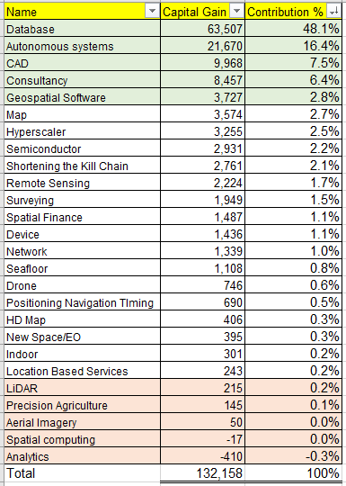 What about pure-play geospatial stocks? They had a capital gain of ‘only’ 22%. Hence it was better to buy the benchmark or the market rather than pure-play geospatial stocks in the past year. And what about the adjacent geospatial stocks alone? Those had the best year of all, 35%.