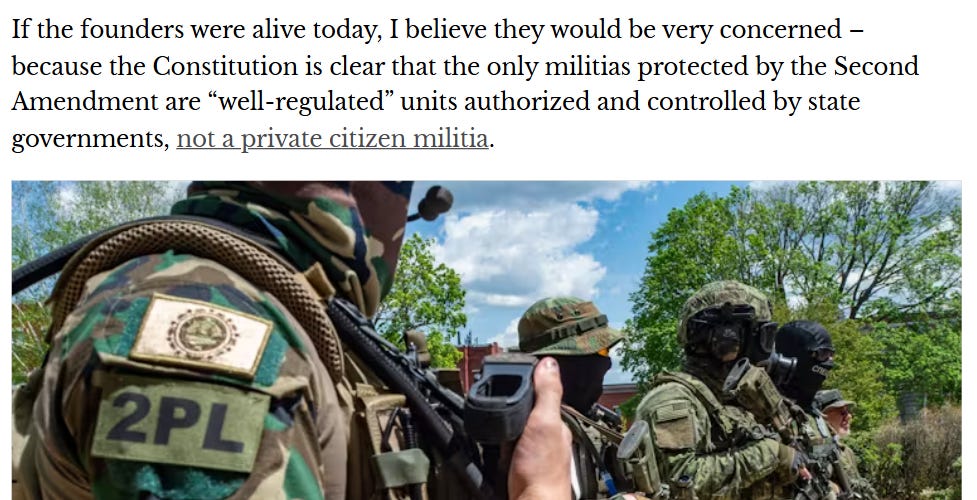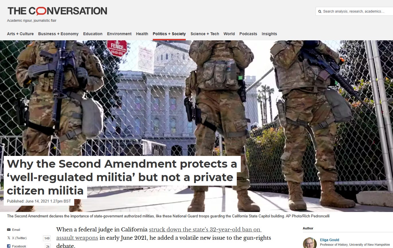 All because of the innocent intent of facilitating the equivalent of a National Guard way back in 1791. For some effective commentary on this issue, we can read ‘Why the second amendment protects a ‘well regulated militia’ but not a private militia’ in The Conversation: