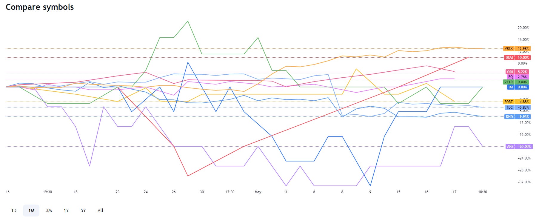 If they were a public company, Map Impact would be in the Analytics sub index of The Geospatial Index. Amongst the components, Verisk is the winner over the past month:
