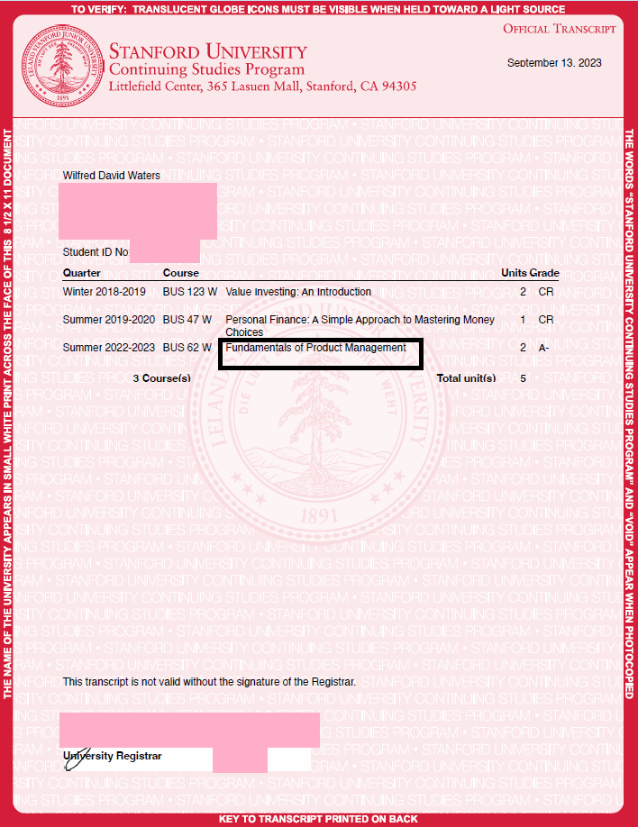 I am a graduate of Fundamentals of Product Management at Stanford Continuing Studies, I achieved an A-: