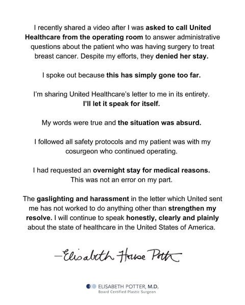 She goes on to say on Instagram that she in fact did intend to request inpatient care after the surgery for her patient. This is despite the health insurer’s claims to the contrary: