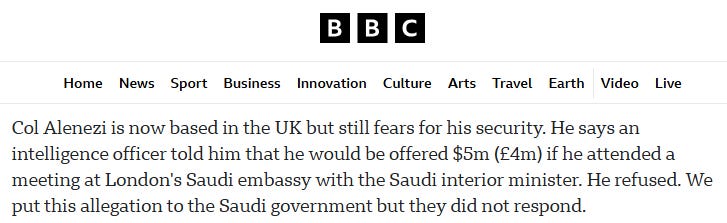 Yes, Johnny Harris, this is what I want to focus on. For these and other words, Khashoggi lost his life in an embassy run by his own country. And what’s worse is the same treatment was offered to another Saudi man with a backbone in self exile, Col Rabih Alenezi. According to the BBC: