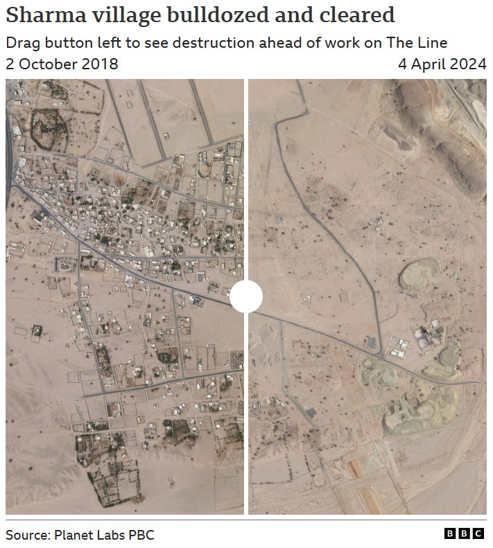 Emphasis his. And a mocking emphasis at that. He then goes on to say the project is interesting because it’s about nation building and a dramatic transformation of Saudi away from oil and the cultural excesses that oil used to permit. Regarding the beach resort plans for Magna, no such justification for terrorising inhabitants or the razing of Sharma and Al-Khraybah is provided.