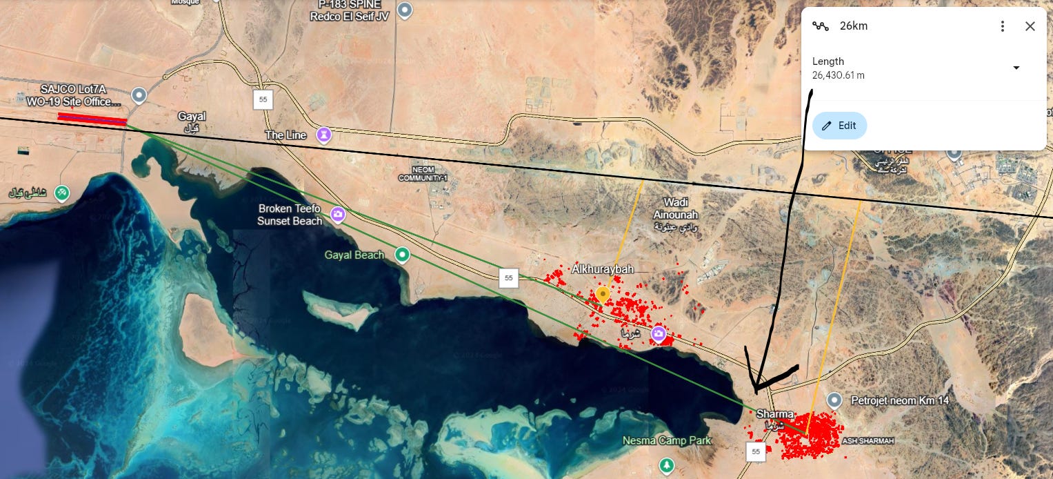 What else can we understand presently? Well, something poignant. The settlement where Abdul Rahim al-Huwaiti was killed was fully 18km from the revised scope of The Line: