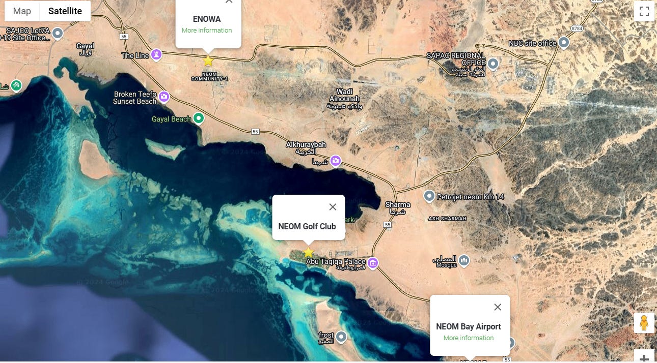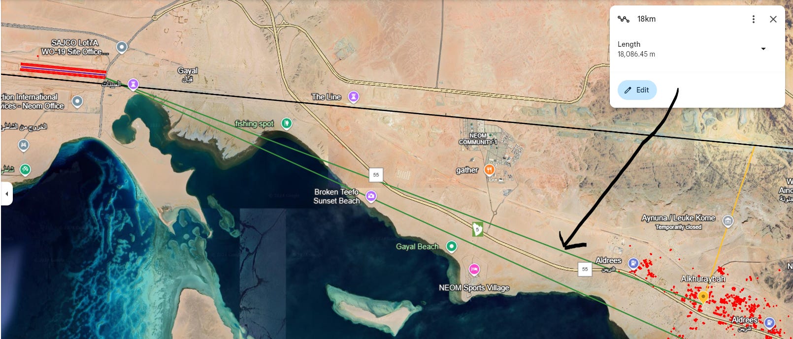 As shown in my simple map using Google Earth, the scope of The Line has been vastly diminished from the initial 170km to 2.4km. This is confirmed in a couple of ways. A Bloomberg article from April 2024 and revised building footprint data for The Line from Overture Maps Foundation that I have downloaded and put on the map. One may wonder, given Neom is a collection of projects, whether there was something else than The Line in scope requiring razing these 2 settlements. I found a map of projects and only a golf course is in the vicinity but not near enough to warrant a razing: