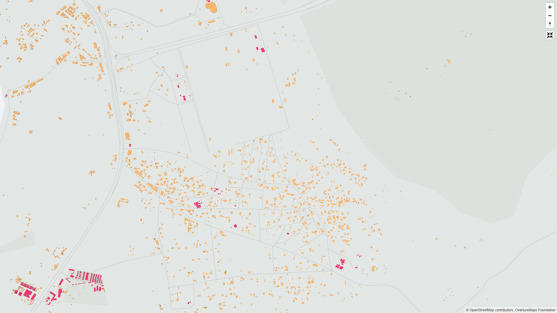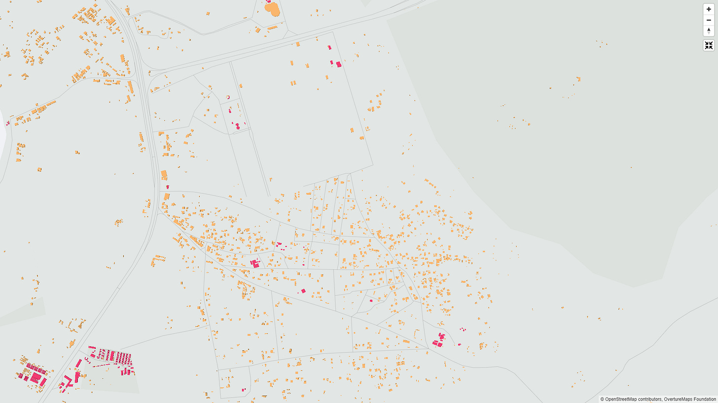 What we know immediately is that these building footprints are at least 3 years out of date, as new satellite imagery, shown above, reveals that all these buildings are now gone. Something to reach out to Overture Maps Foundation about.