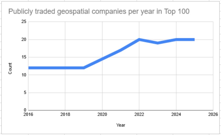 Yesterday was the release of Global Top 100 Geospatial Companies – 2025 Edition. I mentioned this annual list in my end of year summary: