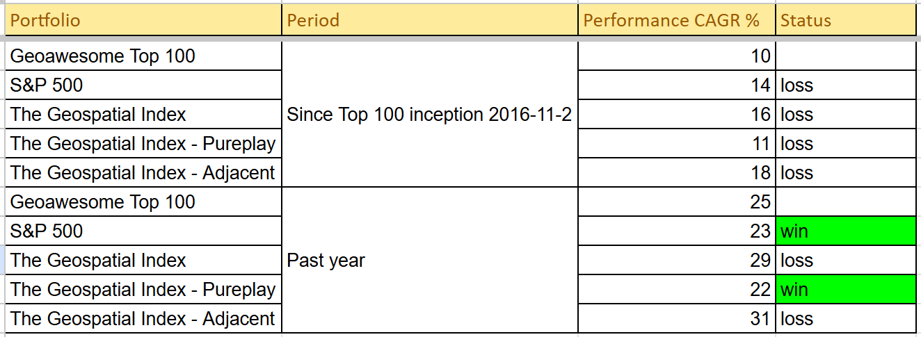 The first Geoawesome Top 100 was published November 2nd, 2016. That inception date applies to the first 5 records in the above table. You can see the performance of a portfolio made of the 12-20 public geospatial companies included in each of the 7 years. It is 10% per annum. This portfolio has unfortunately lost, however, to the market (S&P 500) and any version of my Geospatial Index. The market can be bought as one stock, such as the SPY exchange traded fund.